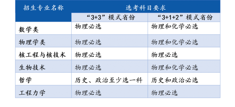 数学类、物理学类、生物技术、哲学、核工程与核技术、工程力学。在非高考综合改革省份,哲学专业招收文科生,其他专业招收理科生。对实行高考综合改革省份的考生,选考科目须满足以下要求: