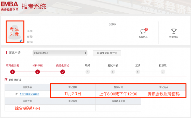 面试分为上下午两个场次,随机安排。具体场次安排及腾讯会议账号信息将于11月18日(周四晚)在报考系统“提前批面试”步骤中公布,届时会有邮件及短信通知查询,请考生及时关注。