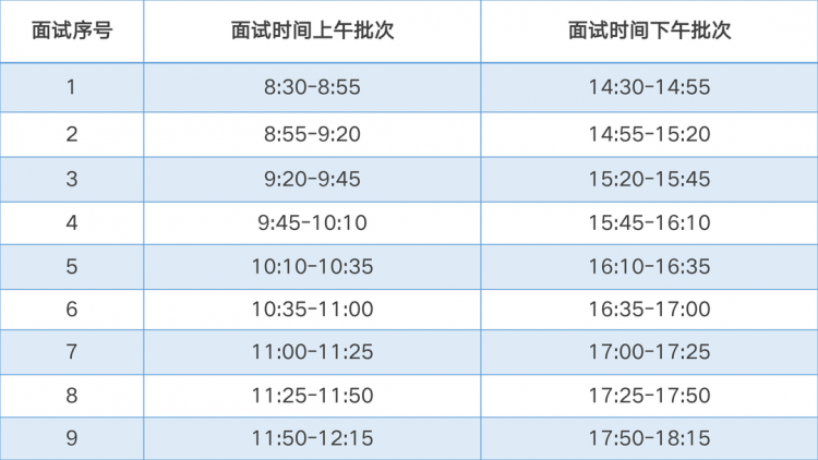 由于考生较多,面试将由系统随机分为上下午两批次进行,中心将于网上资格审核结束之后(预计8月18日17:00前)通过短信及邮件的方式发送面试时间。